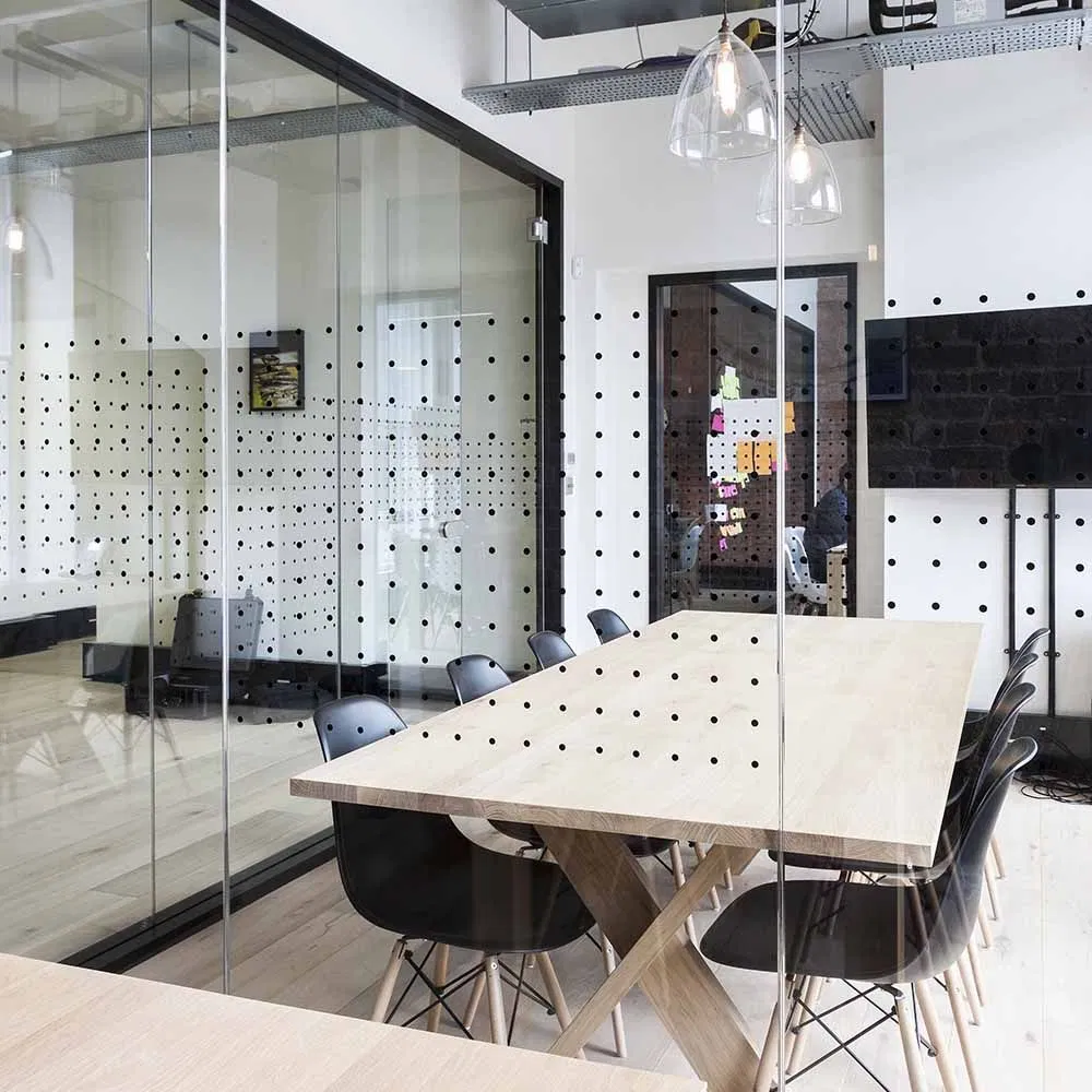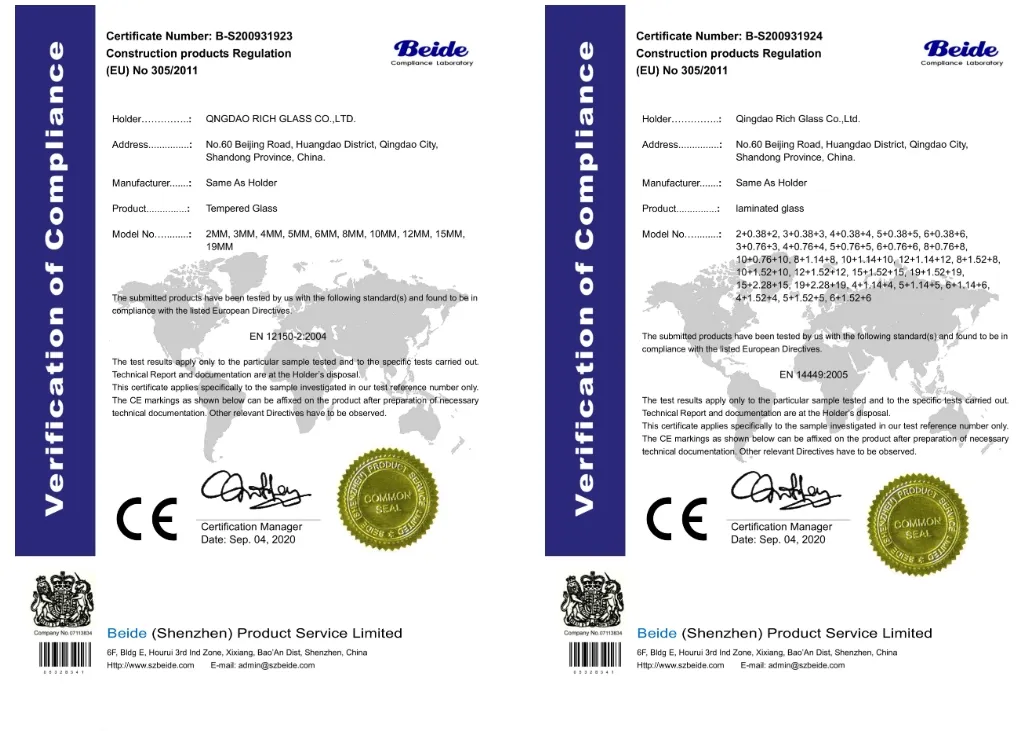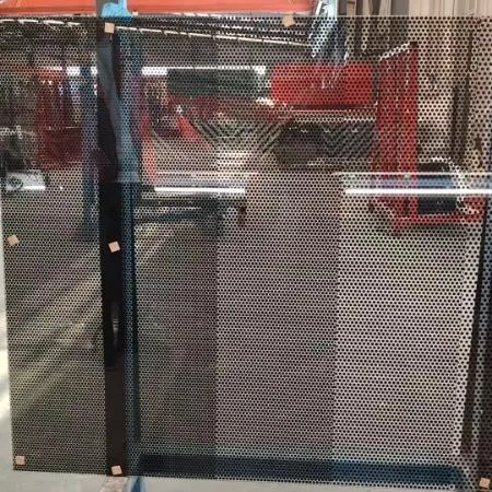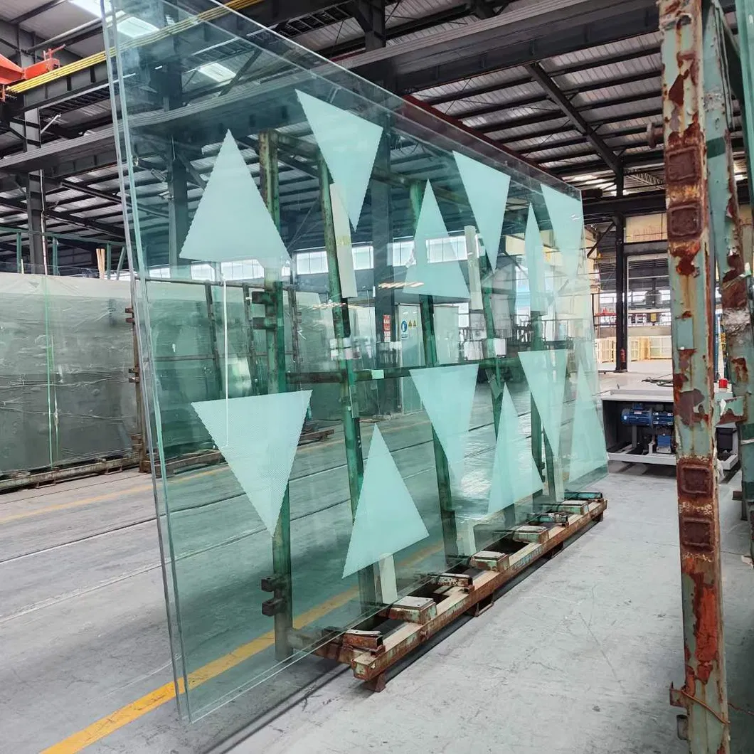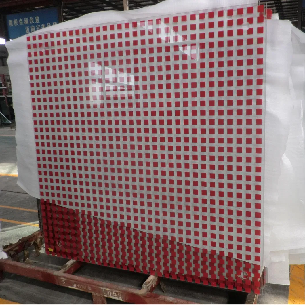 Ceramic fritted glass, also called silk screen printing glass. It is produced by silk screen (or roller) printing ceramic frit paints onto glass followed by drying and heat-treating to form a permanent coating. After printing, the furnace is set to a temperature of 520 ~ 600 °C to fix the pigment and toughen the glass. This process allows for diverse colors and patterns, making it ideal for facade walls, railings, and decorative installations.